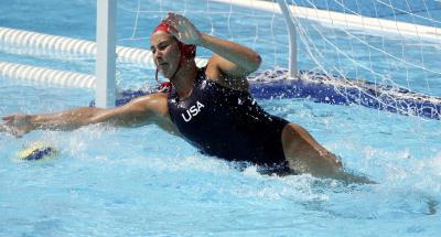 2005年7月29日,美国队门将在门前救险。当日,美国队在加拿大蒙特利尔举行的第十一届世界游泳锦标赛女子水球决赛中,通过加时赛以7比10不敌匈牙利队,屈居亚军。匈牙利队夺得冠军。 新华社记者李岳摄