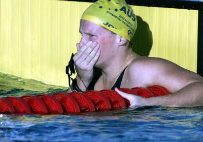 2005年7月29日,澳大利亚选手琼斯打破纪录后喜极而泣。当日,琼斯在加拿大蒙特利尔举行的第十一届世界游泳锦标赛女子200米蛙泳决赛中,以2分21秒72的成绩夺得冠军,并打破了世界纪录。 新华社记者李岳摄