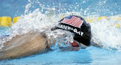 2005年7月29日,美国队第三棒选手范德卡耶在比赛中。当日,在加拿大蒙特利尔举行的第十一届世界游泳锦标赛男子4X200米自由泳接力决赛中,美国队以7分06秒58的成绩夺得冠军。 新华社记者李岳摄