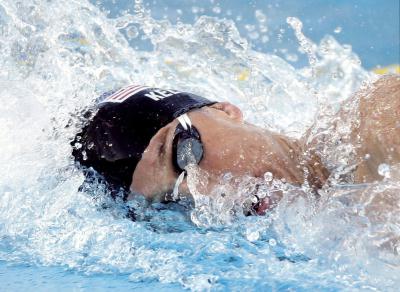 2005年7月29日,美国队第四棒选手凯勒在比赛中。当日,在加拿大蒙特利尔举行的第十一届世界游泳锦标赛男子4X200米自由泳接力决赛中,美国队以7分06秒58的成绩夺得冠军。 新华社记者李岳摄