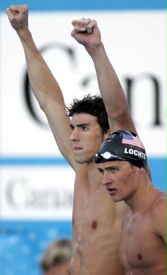 2005年7月29日,美国队选手菲尔普斯(左)与队友一起庆祝胜利。当日,在加拿大蒙特利尔举行的第十一届世界游泳锦标赛男子4X200米自由泳接力决赛中,美国队以7分06秒58的成绩夺得冠军。 新华社记者李岳摄