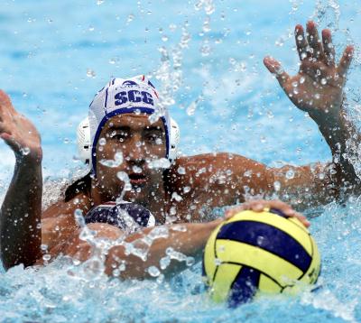 7月30日,塞黑队队员(上)在比赛中防守。当日,塞黑队在加拿大蒙特利尔举行的第十一届世界游泳锦标赛男子水球决赛中,以8比7战胜匈牙利队,夺得冠军。 新华社记者李岳摄