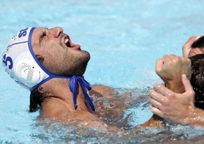 7月30日,塞黑队队员庆祝胜利。当日,塞黑队在加拿大蒙特利尔举行的第十一届世界游泳锦标赛男子水球决赛中,以8比7战胜匈牙利队,夺得冠军。 新华社记者李岳摄