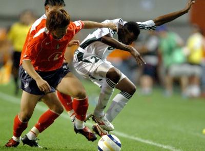 8月17日,沙特阿拉伯队球员塔拉勒 (右)与韩国队球员金珍圭(左)争抢。当日,在2006年世界杯亚洲区预选赛A组最后一轮的比赛中,沙特阿拉伯队客场以1比0战胜韩国队。最终,沙特队与韩国队分列小组第一、二名,携手进入世界杯决赛圈。 新华社/法新