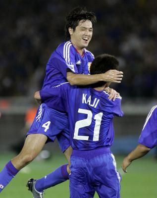 8月17日,日本队球员远藤保仁(左)庆祝队友加地亮进球。当日,在2006年世界杯亚洲区预选赛B组最后一轮的比赛中,日本队主场以2比1战胜伊朗队。最终,日本队与伊朗队分列小组第一、二名,携手进入世界杯决赛圈。 新华社/法新
