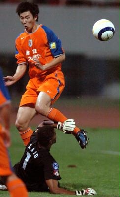 9月14日,山东鲁能队球员(上)带球突破伊蒂哈德队球员的防守。当日,在山东济南进行的2005年亚洲冠军联赛四分之一决赛首回合比赛中,山东鲁能队主场以1比1与沙特阿拉伯伊蒂哈德队战成平局。 新华社记者范长国摄