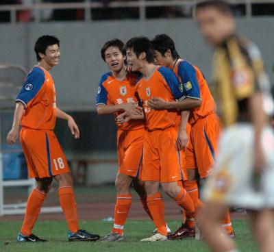 9月14日,山东鲁能队球员在比赛中庆祝进球。当日,在山东济南进行的2005年亚洲冠军联赛四分之一决赛首回合比赛中,山东鲁能队主场以1比1与沙特阿拉伯伊蒂哈德队战成平局。 新华社记者范长国摄