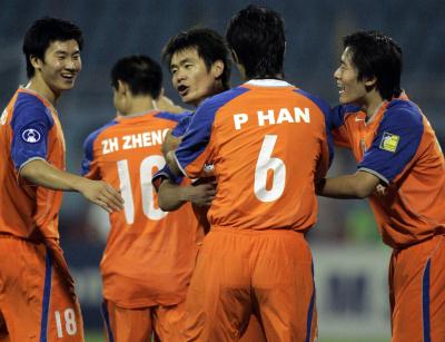 9月14日,山东鲁能队球员李霄鹏(中)在比赛中攻入一球后与队友庆祝。当日,在山东济南进行的2005年亚洲冠军联赛四分之一决赛首回合比赛中,山东鲁能队主场迎战沙特阿拉伯伊蒂哈德队。最终,双方以1比1战平。 新华社记者郭勇摄