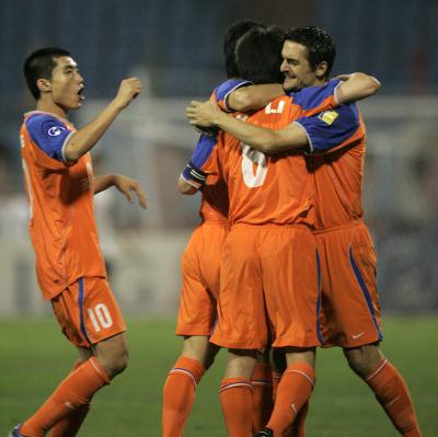 9月14日,山东鲁能队球员在比赛中庆祝进球。当日,在山东济南进行的2005年亚洲冠军联赛四分之一决赛首回合比赛中,山东鲁能队主场迎战沙特阿拉伯伊蒂哈德队。最终,双方以1比1战平。 新华社记者郭勇摄