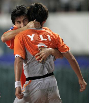 9月21日,深圳健力宝队队员李玮峰(左)与李毅在比赛中庆祝进球。 当日,深圳健力宝队在亚冠联赛四分之一决赛第二回合的比赛中主场迎战沙特阿赫利队。目前深圳队以2比1领先,比赛正在进行当中。 新华社记者 廖宇杰摄