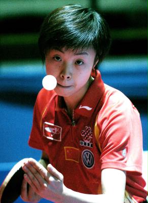 4月24日,中国女队球员张怡宁在比赛中发球。当日,第48届世乒赛团体赛在德国不来梅揭幕,中国女队在首场比赛中以3比0战胜同在A组的捷克女队。 新华社记者吴晓凌摄