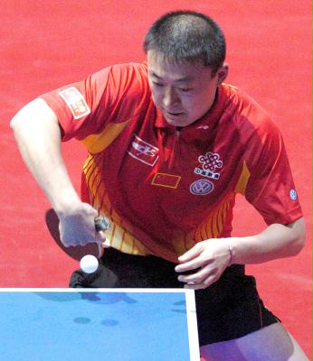 4月24日,中国男队球员马琳在比赛中反手回球。当日,第48届世乒赛团体赛在德国不来梅揭幕,中国男队在首场比赛中以3比0战胜同在A组的罗马尼亚男队。 新华社记者吴晓凌摄