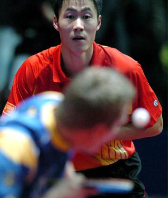 2006年4月27日,中国队选手王励勤以3比0战胜瑞典队选手伦德奎斯特。当日,在德国不来梅举行的第48届世乒赛男子团体A组第四轮比赛中,中国队以3比0的比分完胜瑞典队。 新华社记者吴晓凌摄