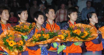 4月30日,中国女队队员与主教练施之皓(右三)在颁奖仪式上。当日,在德国不来梅举行的第48届世乒赛女子团体决赛中,中国队以3比1战胜中国香港队,夺得冠军。 新华社记者吴晓凌摄
