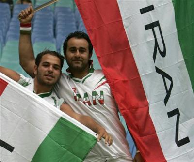 北京时间6月21日晚22时,06德国世界杯小组赛D组第三轮两场比赛同时开打,伊朗队在莱比锡迎战安哥拉队。安哥拉队弗拉维奥和伊朗队巴克蒂亚里扎德赫先后进球,双方以1-1结束比赛,双双无缘16强。图为伊朗球迷在现场助威。 (来源:新浪网)