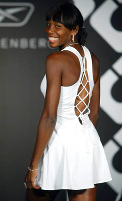 2003年6月20日,美国网球名将维纳斯·威廉姆斯在伦敦展示她的新球衣。她将身着这件白色新装亮相于6月23日开始的温布尔登网球赛。新华社/法新