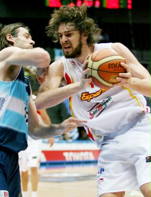 9月1日,西班牙队球员加索尔(右)在比赛中突破。当日,在日本埼玉进行的第15届世界男篮锦标赛半决赛中,西班牙队以75比74战胜阿根廷队,晋级决赛。 新华社记者孟永民摄