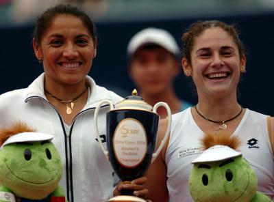 9月24日,西班牙和阿根廷组合帕斯奎尔(右)/苏亚雷斯在比赛后合影。 当日,帕斯奎尔/苏亚雷斯在2006中国网球公开赛女双决赛中,以2比0击败俄罗斯组合查克维塔泽/维斯尼娜,获得冠军。 新华社记者杨宗友摄