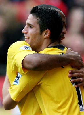 2006年9月30日,阿森纳队球员范佩西为本队攻入第二粒入球后,接受队友亨利的祝贺。当日,在英格兰足球超级联赛第7轮比赛中,客场作战的阿森纳队以2比1击败查尔顿队。 新华社/路透