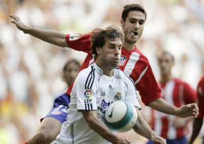 2006年10月1日,皇家马德里队球员范尼斯特鲁伊(下)在比赛中与对手拼抢。当日,在西班牙甲级联赛第五轮的一场比赛中,皇家马德里队主场以1比1战平马德里竞技队。 新华社/路透