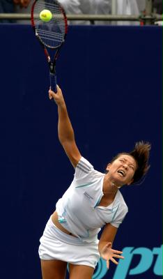 2006年10月8日,中国选手袁梦在泰国曼谷举行的2006曼谷女子网球公开赛资格赛中,以2比0击败泰国选手努帕万·叻奇瓦甘。 新华社记者凌朔摄