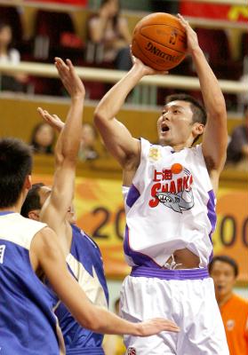 10月10日,上海汇中队球员刘炜(右)在比赛中投篮。当日,在2006-2007CBA联赛第二轮比赛中,上海汇中队主场以111比110战胜东莞新世纪队。