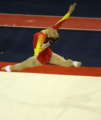 2006年10月17日,中国体操女队队员张楠在自由体操比赛中。当日,2006世界体操锦标赛女子资格赛在丹麦阿胡斯举行,中国队以239.525分排名第二,仅次于美国队的243.325分,晋级决赛。 新华社记者费茂华摄