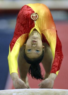 2006年10月17日,中国体操女队队员程菲在跳马比赛中。当日,2006世界体操锦标赛女子资格赛在丹麦阿胡斯举行,程菲以16.075分的成绩在女子跳马资格赛中排名第一,晋级决赛。 新华社记者费茂华摄
