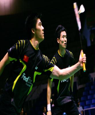10月20日,中国选手蔡赟/付海峰(左)在2006年中国羽毛球公开赛男子双打四分之一决赛中,以2比1战胜队友张伟/孙君杰,进入半决赛。 新华社记者韩岩摄