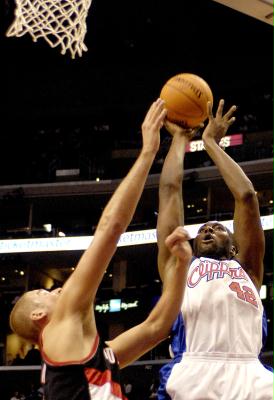 2006年10月25日,洛杉矶快船队队员布兰德(右)在比赛中上篮。当日,在NBA季前赛中,洛杉矶快船队主场以97比89战胜波特兰开拓者队。 新华社记者戚恒摄
