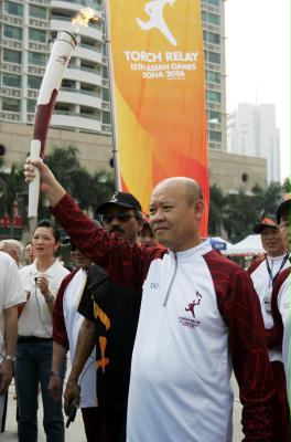2006年10月26日,第15届多哈亚运会澳门体育代表团团长、澳门奥林匹克委员会第一副主席萧威利手举火炬进行传递。当日,第15届多哈亚运会火炬在中国澳门传递。 新华社记者王丽莉摄