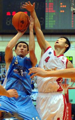 2006年10月27日,北京金隅队球员张云松(左)在比赛中投篮。当日,在CBA联赛第九轮比赛中,八一双鹿队主场以93比80战胜北京金隅队。 新华社记者徐昱摄