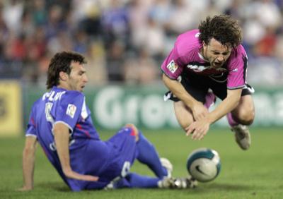 10月29日,拉科鲁尼亚队队员冈萨雷斯(右)在比赛中与对方球员拼抢。当日,在西甲联赛第八轮比赛中,拉科鲁尼亚队客场以0比2负于赫塔菲队。 新华社/路透