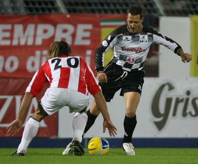 10月29日,前F1法拉利车队车手舒马赫(右)在意大利维琴察举行的一场全国车手队与维琴察全明星队的比赛中与对手拼抢。 新华社/法新