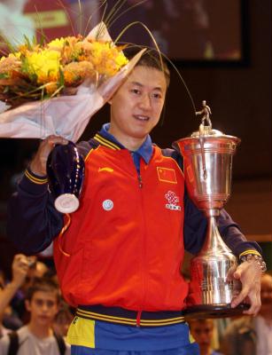 10月29日,中国选手马琳在2006年世界杯男子乒乓球赛冠军争夺战中,以4比3战胜队友王皓,成功夺冠。 新华社记者 宋立东摄