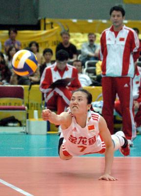 2006年11月9日,中国女排队员周苏红在比赛中飞身救球。当日,在日本大阪举行的世界女排锦标赛第二阶段的比赛中,中国队以2比3惜败于巴西队,无缘四强。 新华社记者马平摄