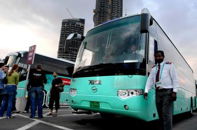 2006年11月26日,在多哈亚运会新闻中心班车停车场,几名记者正准备乘坐班车前往体育场馆。 第15届亚运会12月1日将在卡塔尔首都多哈开幕,来自中国的500辆海格客车被选定为亚运会赛事专用车,用于比赛期间运动员、官员及媒体记者的接送工作。 新华社记者李紫恒摄
