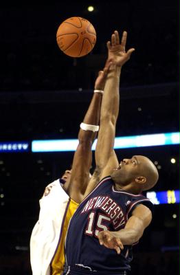 2006年11月26日,网队球员卡特(右)与湖人队球员争球。当日,在洛杉矶举行的NBA常规赛中,洛杉矶湖人队主场以99比93战胜新泽西网队。 新华社记者戚恒摄