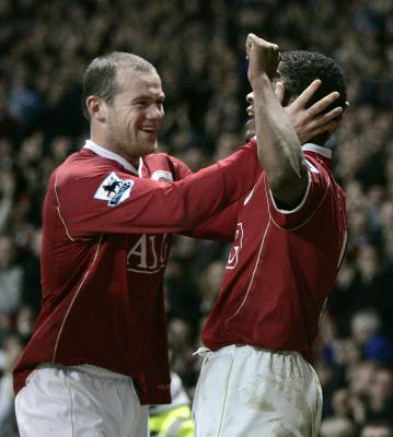 2006年11月29日,曼联队球员埃弗拉(右)在攻入一球后与队友鲁尼一起庆祝。当日,在英超联赛第15轮比赛中,曼彻斯特联队主场以3比0战胜埃弗顿队。 新华社/路透