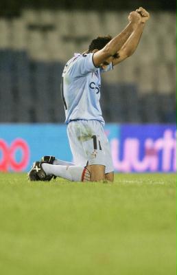 2006年11月30日,塞尔塔队球员古斯塔沃在进球后庆祝。当日,在欧洲足球联盟杯H组比赛中,西班牙塞尔塔队主场以1比0小胜土耳其费内尔巴赫切队。 新华社/路透