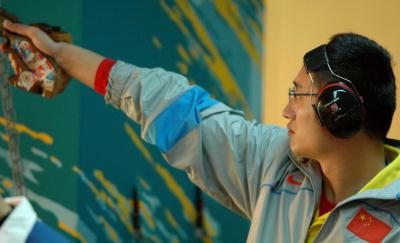 2006年12月5日,中国选手谭宗亮在比赛中。当日,由谭宗亮、庞伟、徐坤组成的中国队在多哈亚运会射击男子50米手枪慢射团体比赛中,以1682环的成绩获得金牌。 新华社记者格桑达瓦摄
