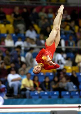 2006年12月6日 ,中国选手程菲在比赛中。当日,程菲夺得多哈亚运会女子自由体操冠军。 新华社记者王雷摄