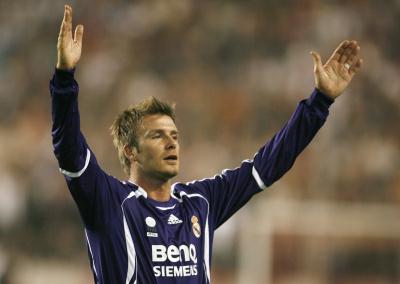 2006年12月9日,西班牙皇家马德里队球员贝克汉姆射门得分后庆祝。当日,在西班牙甲级联赛第14轮的比赛中,皇家马德里队客场以1比2不敌塞维利亚队。