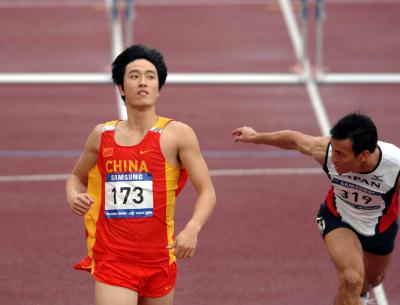 2006年12月11日,中国选手刘翔(左)在男子110米栏预赛中冲线。当日,刘翔在多哈亚运会男子110米栏比赛中,以13秒74的成绩获得小组第一,轻松通过预赛。
