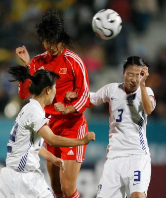 2006年12月13日,中国队球员王坤(中)与韩国队球员争顶。当日,在多哈亚运会女子足球铜牌争夺战中,中国队以2比0战胜韩国队,获得铜牌。 新华社记者廖宇杰摄