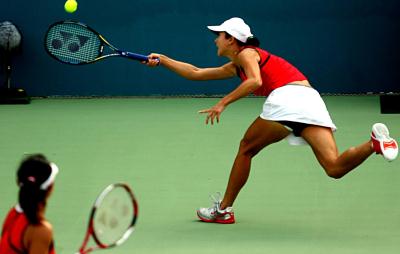 2006年12月14日,中国选手郑洁/晏紫(右)在比赛中。当日,在多哈亚运会网球女双决赛中,郑洁/晏紫以2比0战胜中国台北选手詹咏然/庄佳容夺得冠军。 新华社记者张明摄
