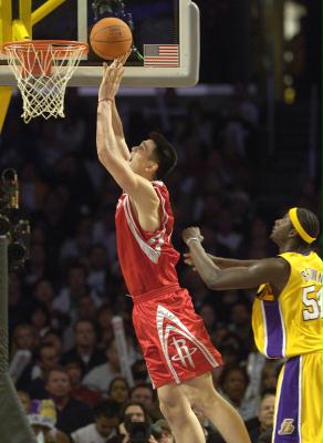2006年12月15日,火箭队球员姚明(左)在比赛中投篮。当日,在NBA常规赛中,火箭队客场以101比112不敌洛杉矶湖人队。 新华社记者戚恒摄