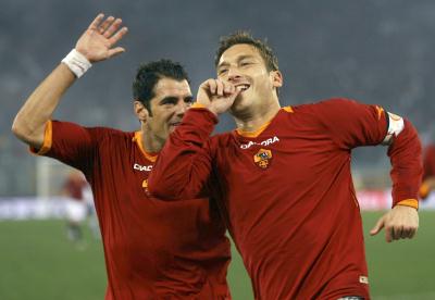 2006年12月2日,罗马队球员托蒂(右)在进球后与队友佩罗塔一起庆祝。当日,在意大利足球甲级联赛第14轮比赛中,罗马队主场以2比1战胜亚特兰大队。 新华社/路透