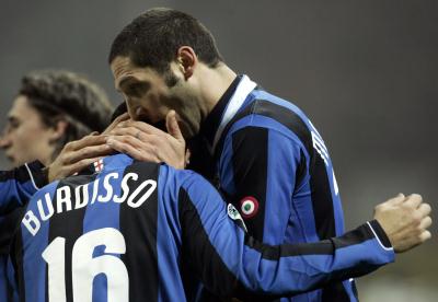 2006年12月2日,国际米兰队球员布尔迪索(左)在进球后与队友马特拉奇庆祝。当日,在意大利足球甲级联赛第14轮比赛中,国际米兰队主场以2比0战胜锡耶纳队。 新华社/路透