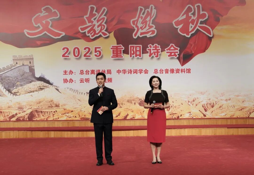 枫影婆娑送秋意,诗韵铿锵迎重阳。在这个充满诗意与温情的传统佳节来临之际,中央广播电视总台离退休干部局携手中华诗词学会、总台音像资料馆,及云听、央视频等部门共同举办了“文韵燃秋——2025重阳诗会”,总台近20位退休播音员主持人、朗诵爱好者,以及老年合唱、舞蹈、模特、器乐、戏剧等协会的老同志们联袂登场,以诗传情,以艺会友,共迎重阳佳节。